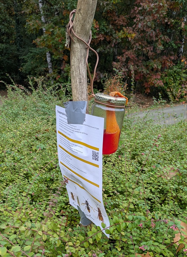 Omdat er nogal veel Aziatische hoornaars in de buurt van ons park actief zijn, wordt er gezocht naar de nesten. Er is een lokpot op ons terrein geplaatst. Vriendelijk verzoek om hier niet aan te komen.